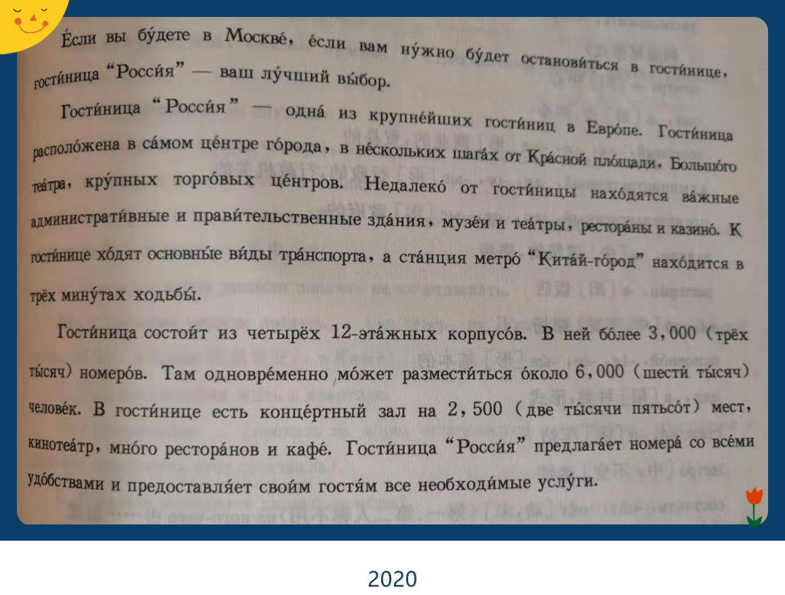 “俄羅斯”賓館是歐洲比較大的賓館之一。賓館位于城市中心,離紅場、大劇院、大型貿(mào)易中心幾步之遙。離賓館不遠處坐落著重要的行政和政府大樓、博物館和劇院、飯店和賭場。主要交通工具都通往賓館,而“中國城”地鐵站離此步行只有3分鐘的距離。