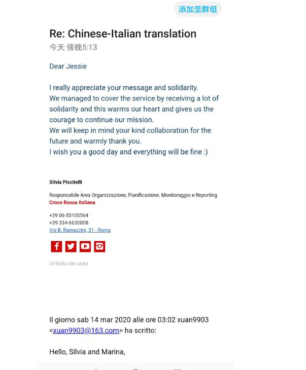 中國抗疫醫(yī)療專家組當(dāng)?shù)貢r間12日晚(中國時間13日清晨)抵達意大利首都羅馬。羅馬紅十字會緊急征招中文-意大利語譯員,協(xié)助中國專家組完成和意大利方面的溝通工作。迪普勒積極調(diào)動譯員資源,為中意共同抗擊新冠疫情的合作積極貢獻了自己的一份力量。在肆虐的病毒面前,沒有膚色,沒有國籍,沒有文化和價值觀差異,每個人都是一個鮮活的生命,其健康、安全和生存的權(quán)利都值得尊重,值得我們?yōu)橹Α?/p>
